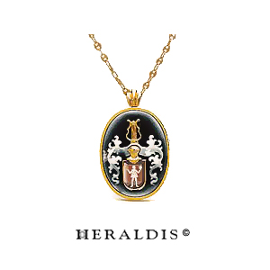 Der Granat für das rote Schild. Der Helm und die Lyra in 18 Karat Gold. Die Decken als Gemme in Lagenstein graviert. In Gelbgold eingefasst und als kombination Anhänger oder zum anstecken gefertigt.